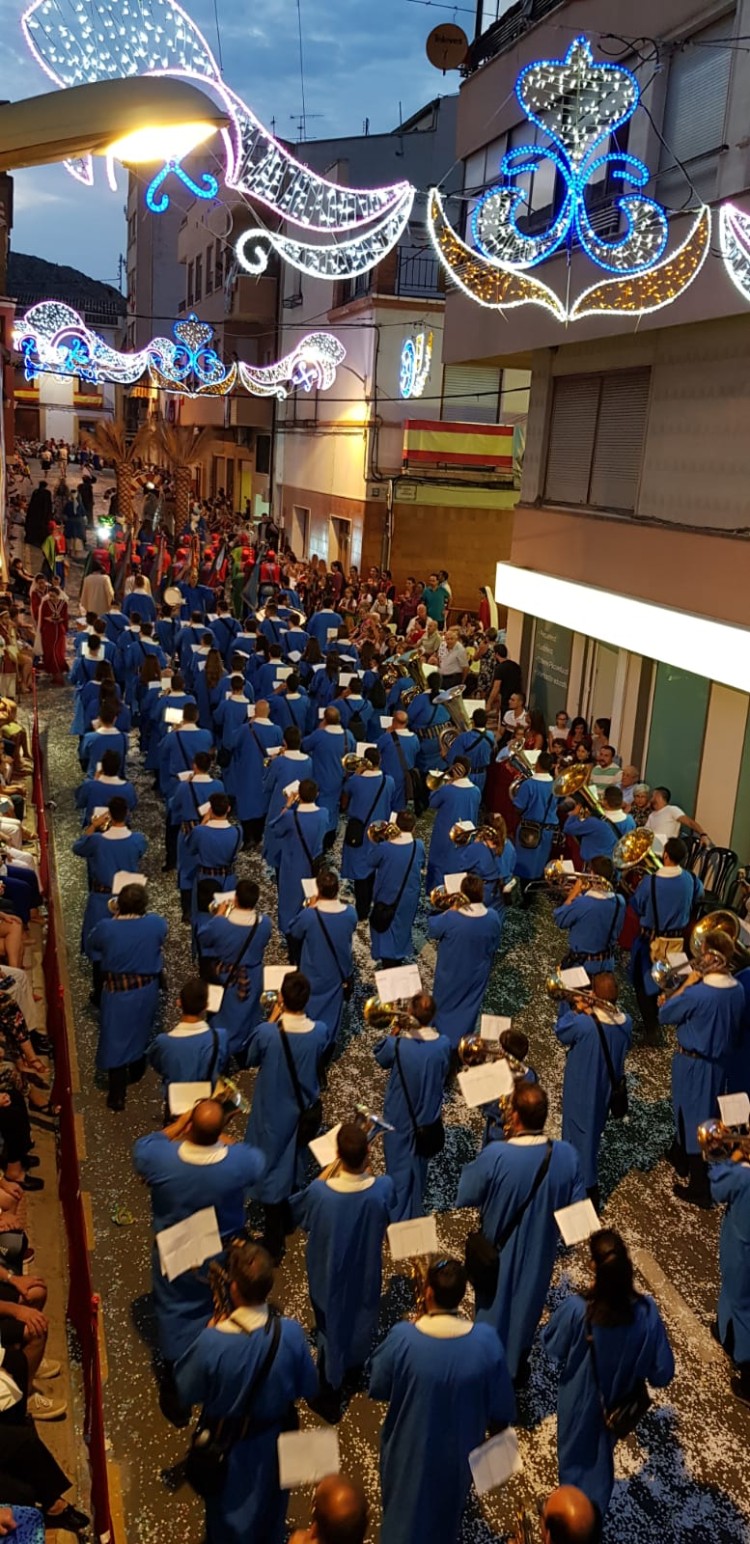 En el s. XIX surge la necesidad de incorporar nuevos elementos como es la banda de música, esta agrupación surge por la influencia de las bandas que acompañaban a las tropas de Napoleón. Alcoy, ciudad pionera en la Revolución Industrial, adapta las primitivas «comparsas» a «filaes» con nombres referentes a la guerra de la Reconquista. En un principio las «filaes» desfilaban sin música o acompañados de música de retreta (trompetas y cajas). En 1817 la Filà Llana de Alcoy contrató la banda miliciana de la ciudad, «La Primitiva», para acompañar a sus festeros a los actos. Esta iniciativa pronto fue imitada por diferentes pueblos donde se desarrollan las fiestas de Moros y Cristianos. La música que se tocaba eran polcas, mazurcas, habaneras, valses y surgió la necesidad de crear una música específica para las fiestas.
